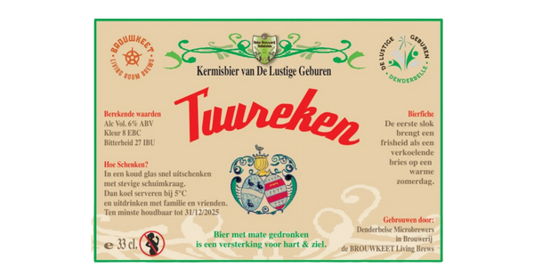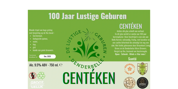 Een Eeuw In Een Fles: Centéken niets minder dan een echte mijlpaal: 100 jaar geleden stak een groep enthousiastelingen in Denderbelle de koppen bij elkaar en legde zo de kiem voor wat vandaag nog steeds één van de meest geliefde kermissen in de regio is. Die eeuw wordt in 2025 gevierd met iets dat even zeldzaam is als het jubileum zelf: Centéken, een Belgische tripel van formaat, gebrouwen ter ere van het honderdjarig bestaan van De Lustige Geburen. Het bier is het geesteskind van Jo Abbeloos en Luc Criel, twee gepassioneerde brouwers en bierliefhebbers, die in samenwerking met Brouwerij De Brouwkeet Living Brew's tot een verbluffend resultaat kwamen.